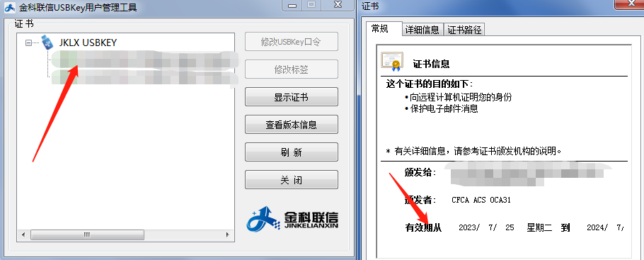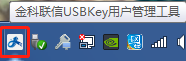 1、将我司的CA证书插入到电脑USB接口上点击电脑屏幕右下角“金科联信USBKey用户管理工具”图标。
