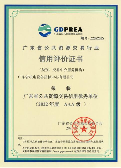 广东省公共资源交易信用优秀单位(2022年度AAA级)